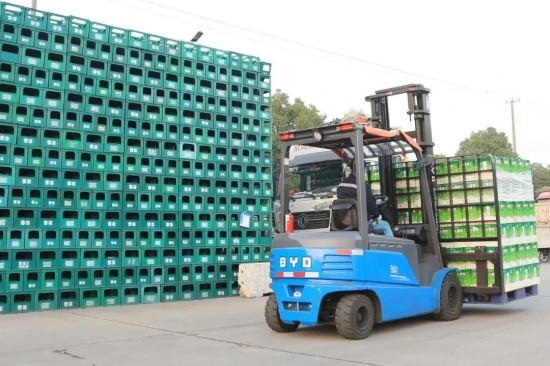 新能源叉車配置的磷酸鐵鋰電池,具有安全、環(huán)保的特性,且零排放、無污染,在保障生產(chǎn)環(huán)境安全作業(yè)的同時,為廠區(qū)原材料食品安全筑起防護墻,嚴格杜絕了原材料在搬運過程中遭受二次污染的可能。同時比亞迪鋰電池叉車性能可靠、動力強勁、隨充隨用、壽命長,可充分滿足啤酒企業(yè)高負荷運轉需求。